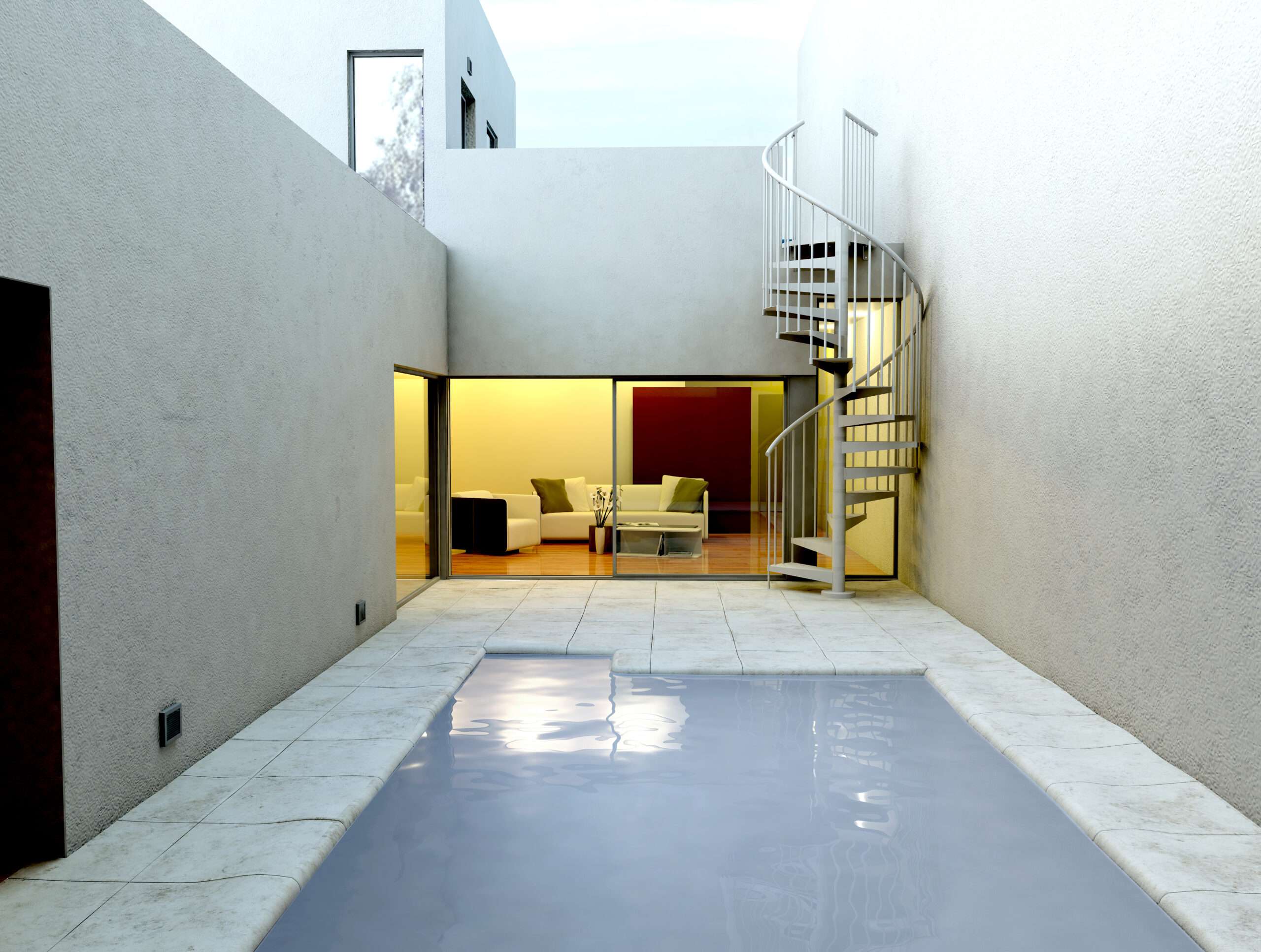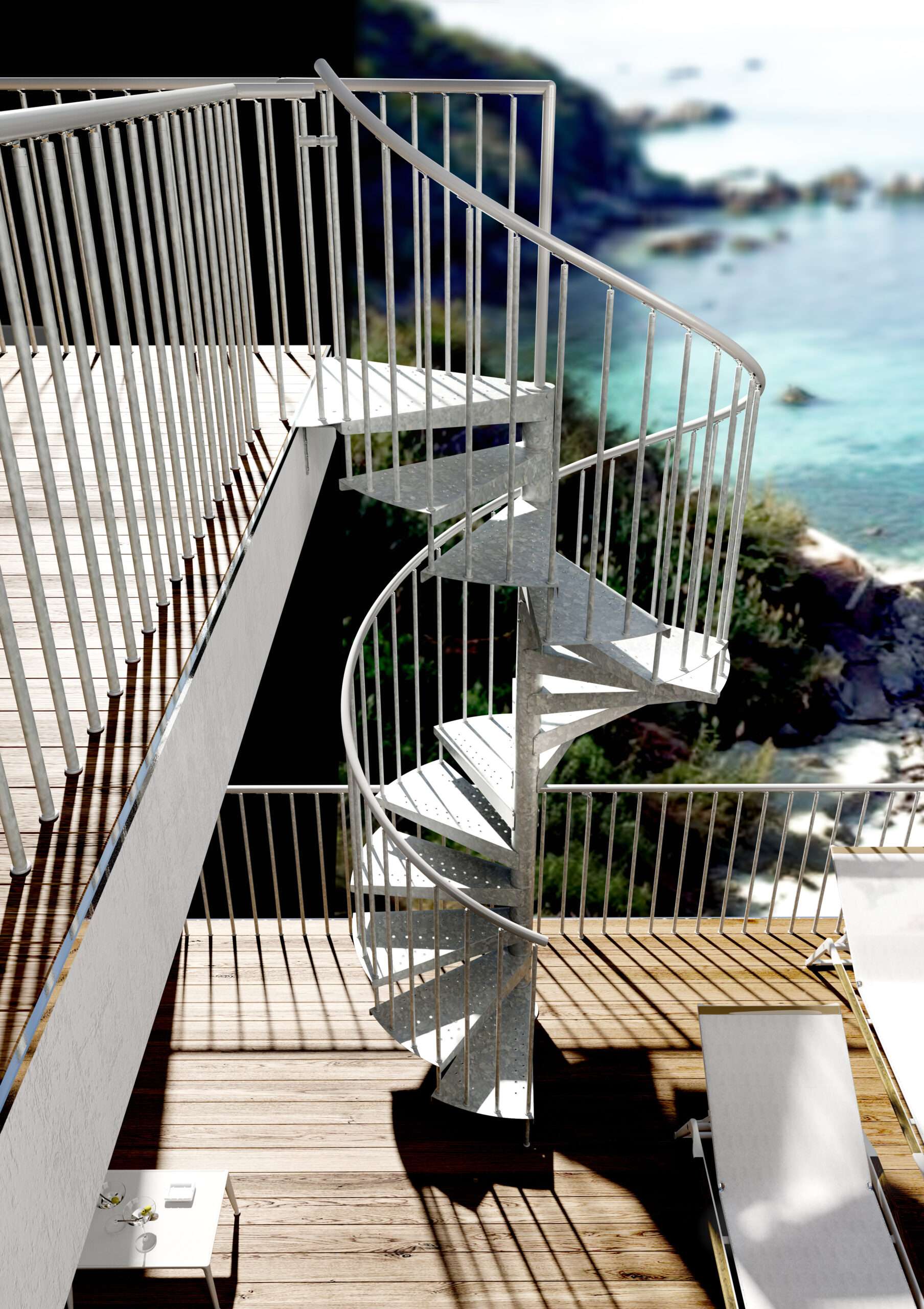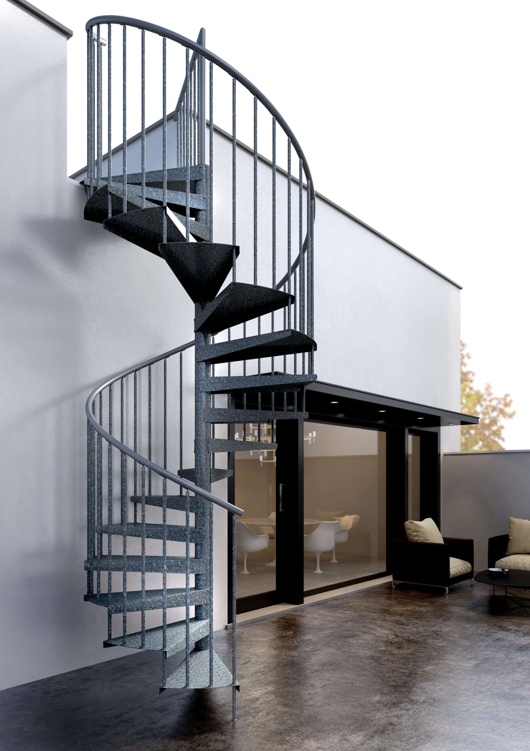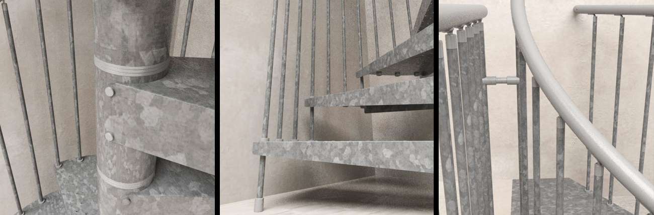 • Stufen aus tiefgezogenem Blech, verschraubt an Distanzstücken, ohne Schweißnähte