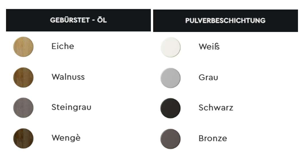 Die Holzoberflächen werden mit einer Kombination aus Wachsen und natürlichen Ölen („NATURAL OIL“) behandelt und sind in vier Farbvarianten erhältlich – die optimale Lösung für langlebige Trittflächen.