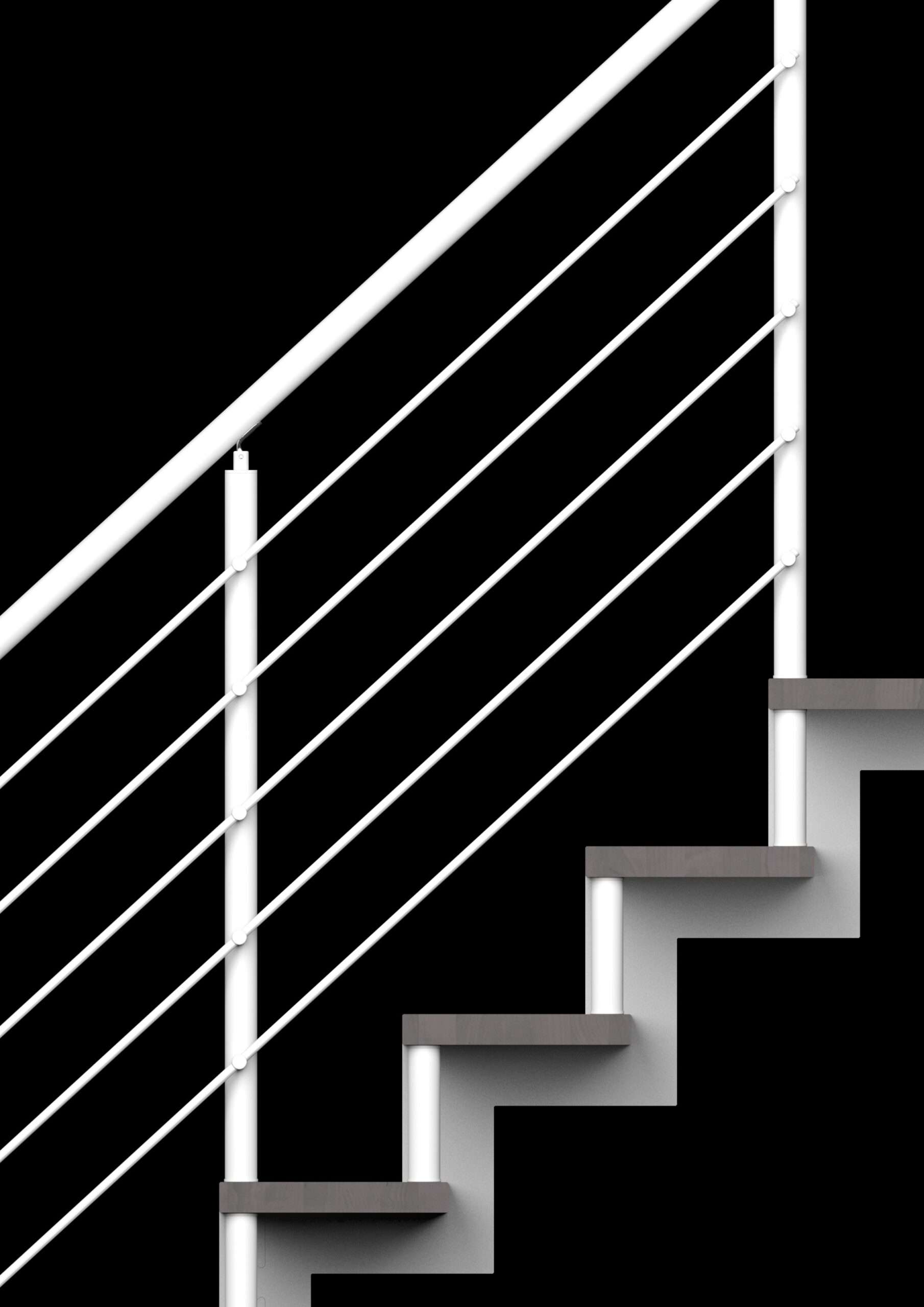 Das Geländer bestehend aus Pfosten aus Metallrohr mit 5 parallelen Drähten, die der Form der Treppe folgen. Das Handlauf ist aus Metall, und die Verbindungsstücke sind aus Kunststoff, farblich passend zur Struktur.