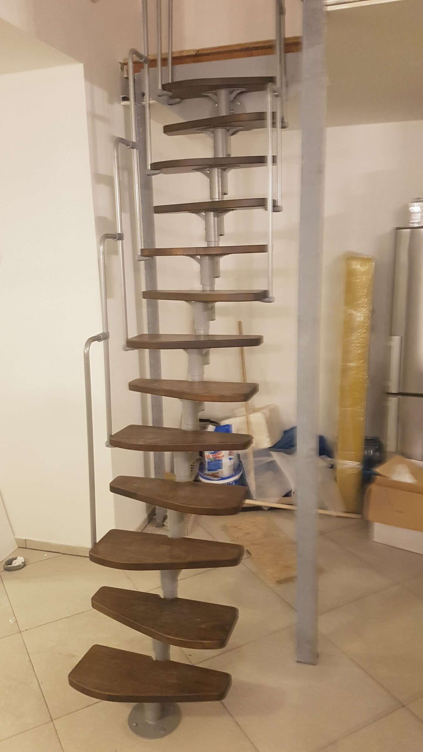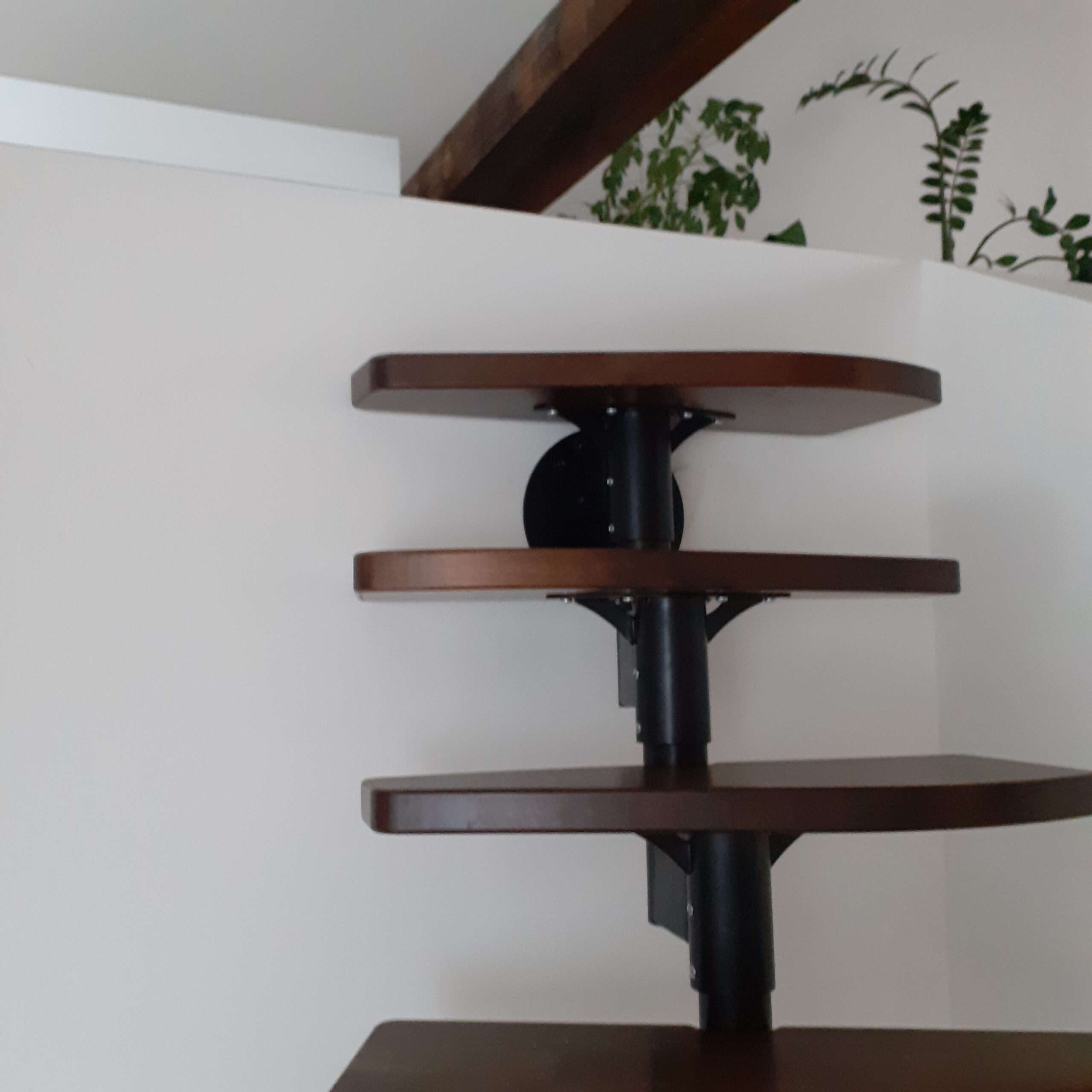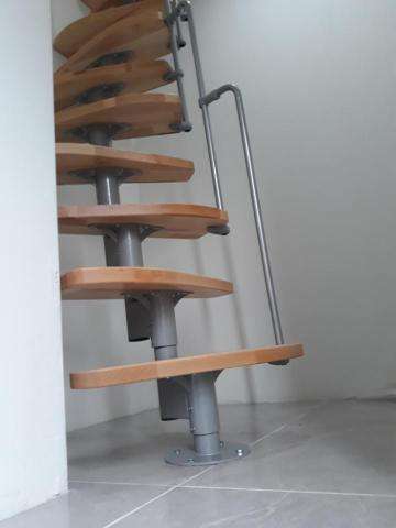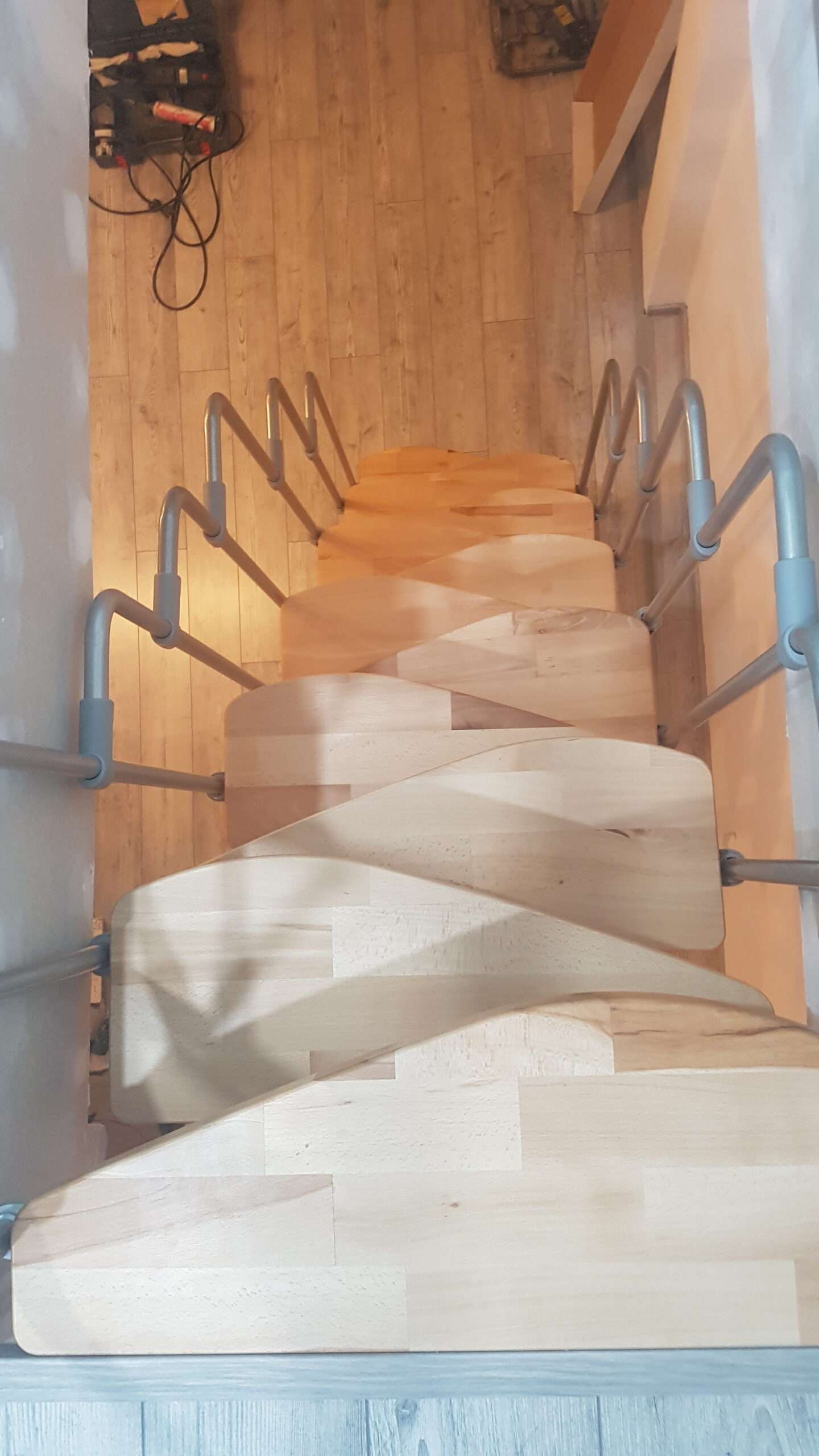 - Raumspartreppe mit elegant abgerundeten Holzstufen und geradem Metallgeländer
