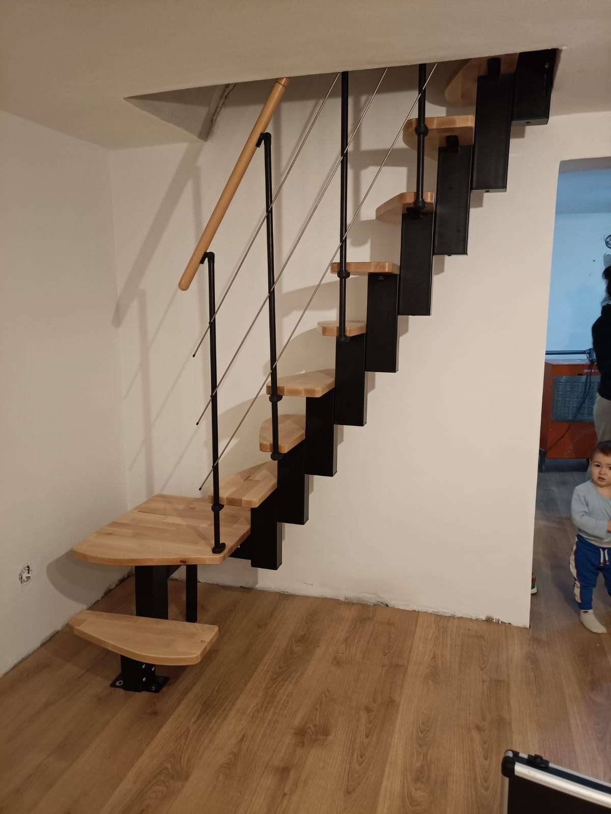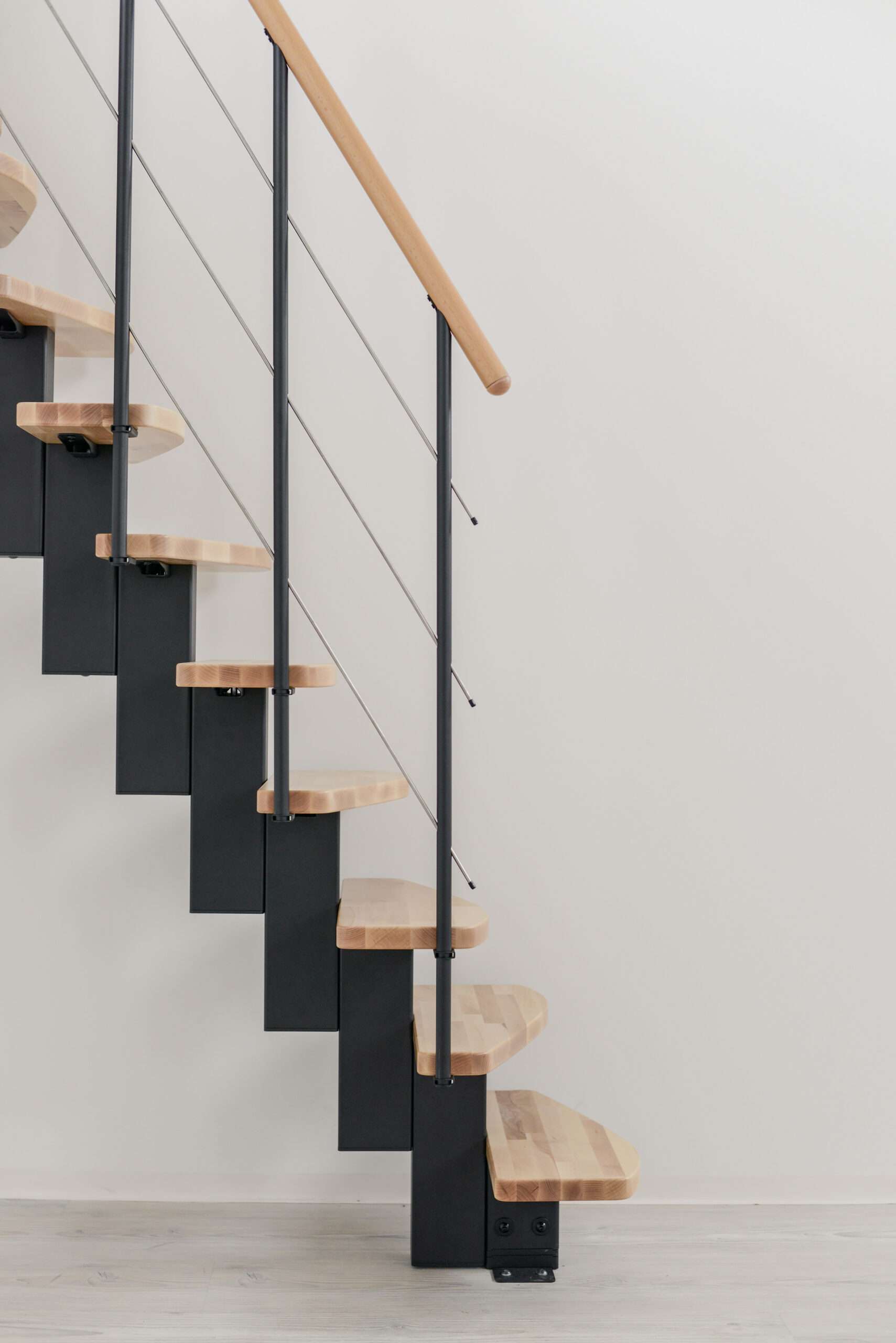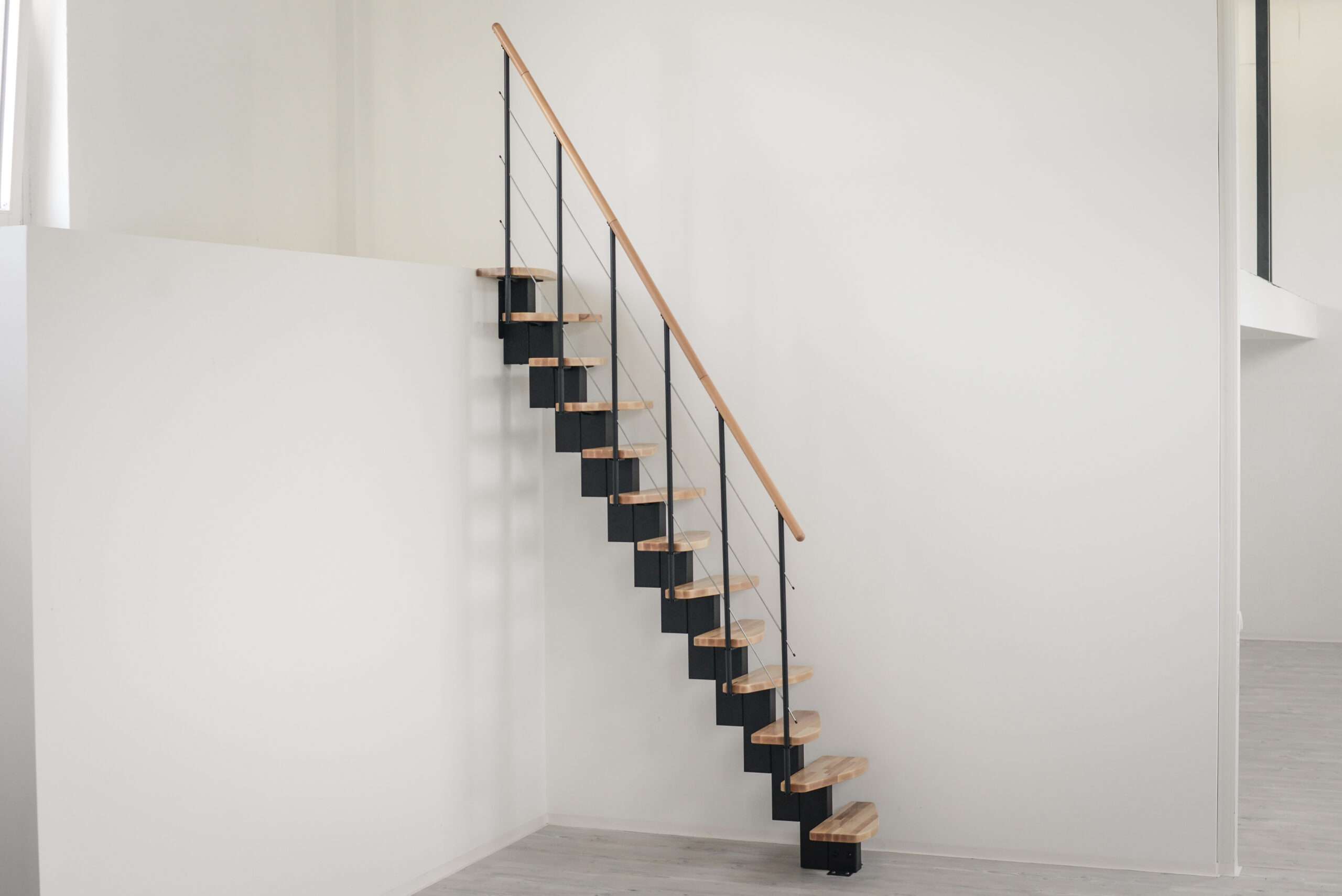 Wie alle Treppen von Minka ist auch die Quatro flexibel an Ihre Bedürfnisse anpassbar. Beim Holz der Stufen und des Handlaufes können Sie zwischen Buche oder einer etwas dunkleren Walnussoptik wählen. Die Metallteile sind entweder in markantem Schwarz oder in dezenterem Grau oder Weiß gehalten. Somit können Sie einen individuellen Look je nach Ihren Wünschen zusammenstellen.
