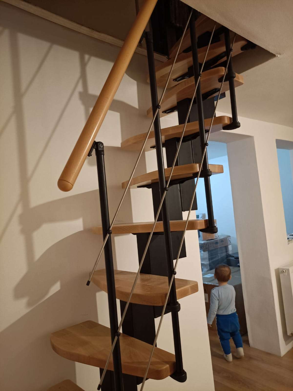 Die Raumspartreppe Quatro von Minka besticht mit einem innovativen Design im Industrial Chic. Markante Metallteile vereint mit sanft geschwungenen Holzstufen machen den modernen Look der Quatro Raumspartreppe aus. Der Handlauf aus massivem Echtholz schmiegt sich angenehm in die Hand und macht Treppensteigen zu einem wahren Genuss.