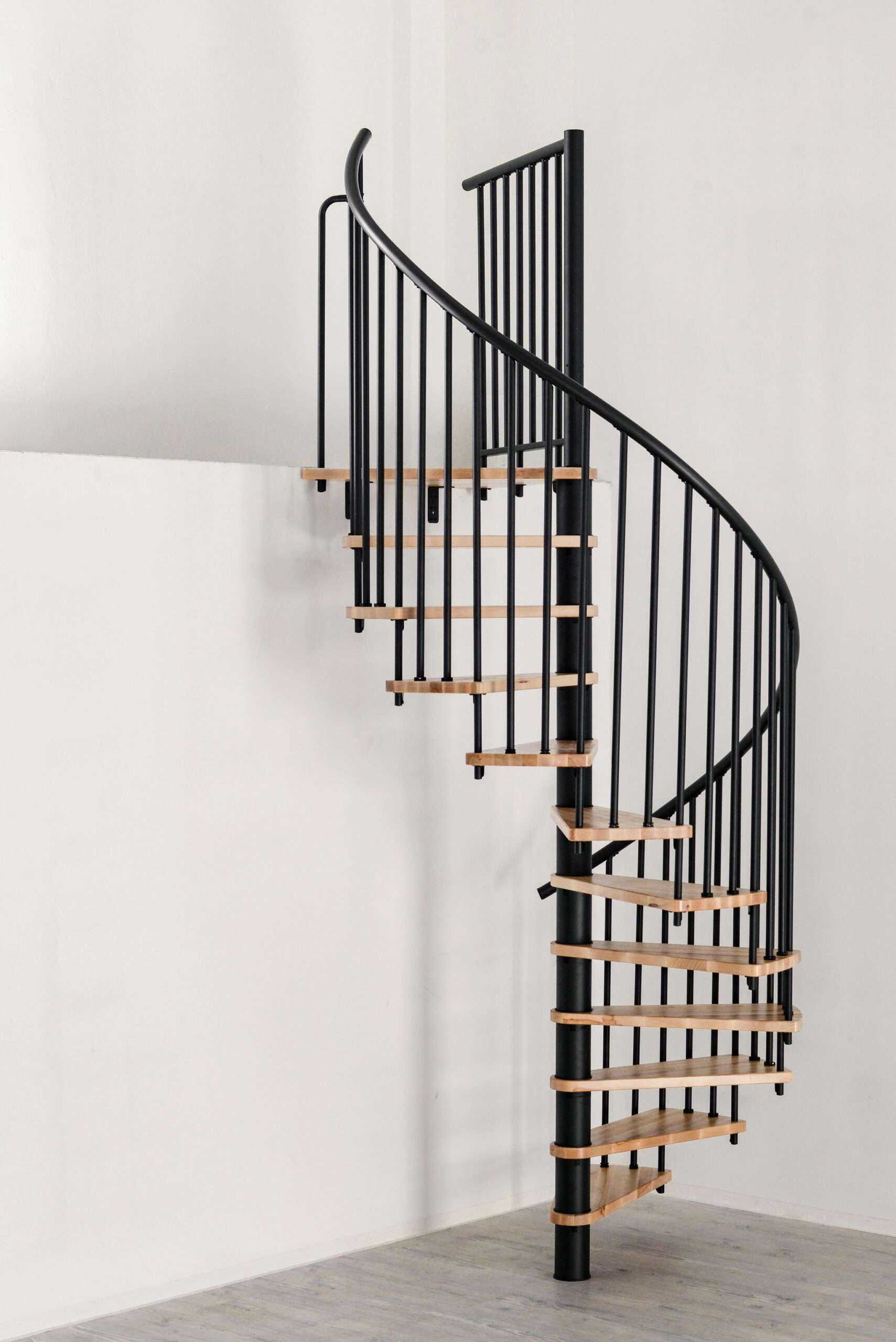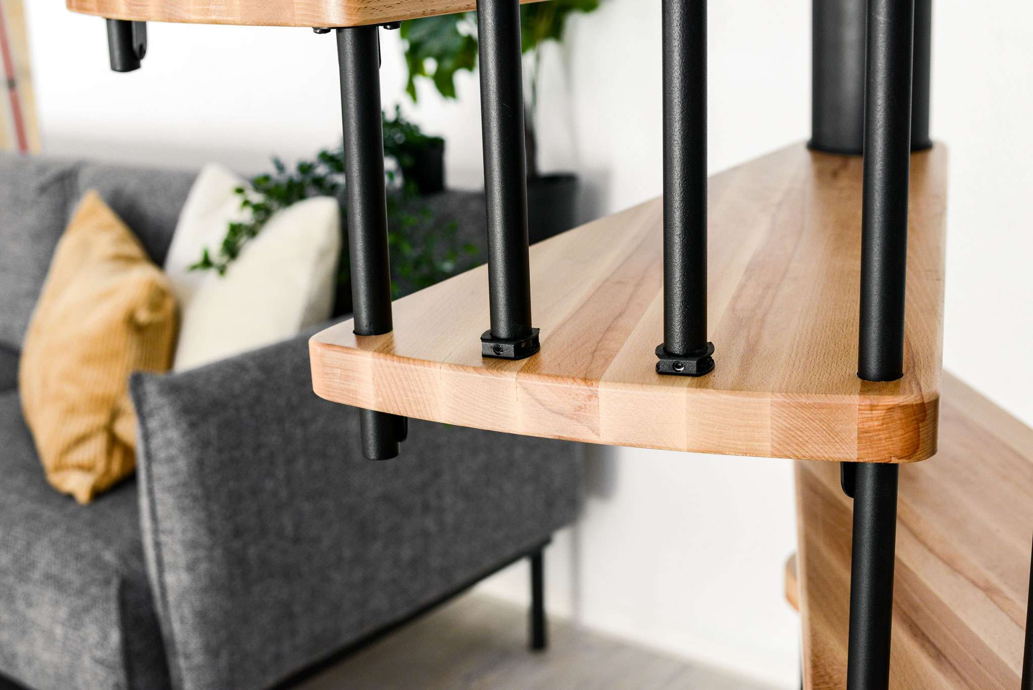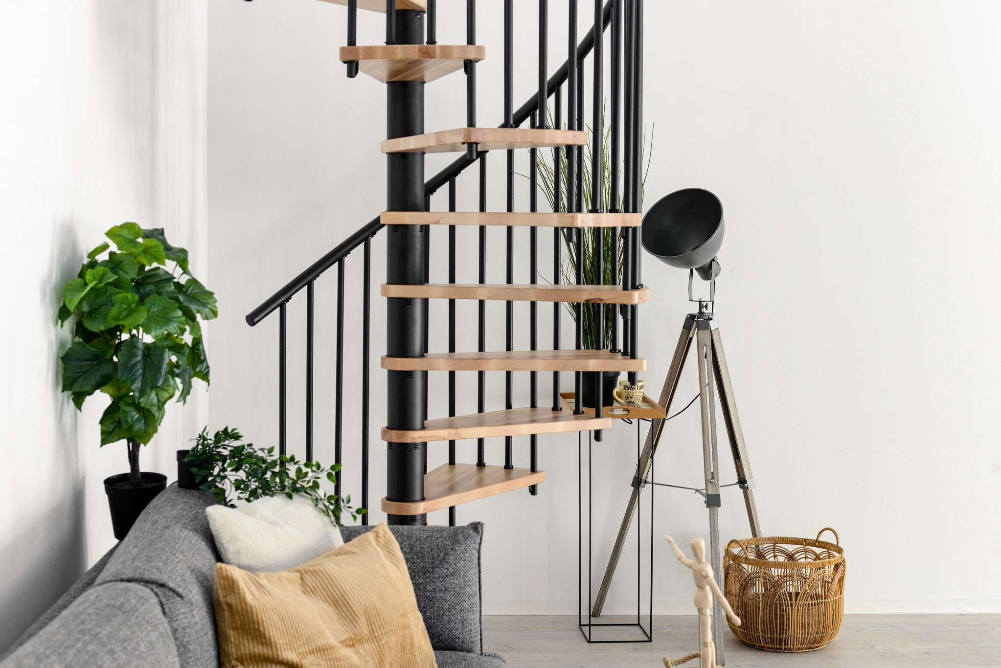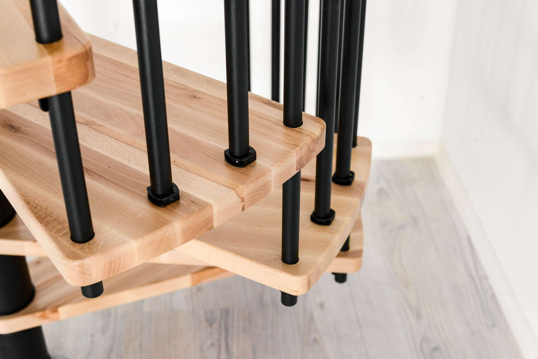 Die Spindeltreppe Spiral Smart ist in vier verschiedenen Größen erhältlich. Der Durchmesser kann 100, 120, 140 oder 160 cm betragen. Aber auch optisch bietet die Spiral Smart vielfältige Gestaltungsmöglichkeiten. Die Stufen bestehen entweder aus Eichenholz oder aus Buchenholz. Wahlweise gibt es die Buchenstufen außerdem auf eine dunklere Walnussoptik oder Weiß gebeizt. Die Metallteile der Treppe sowie der Handlauf aus hochwertigem PVC können passend dazu entweder in Schwarz, Grau oder Weiß gewählt werden. Sie können sich Ihre Treppe also individuell zusammenstellen lassen, damit diese auf jeden Fall zu Ihrem Einrichtungsstil passt.