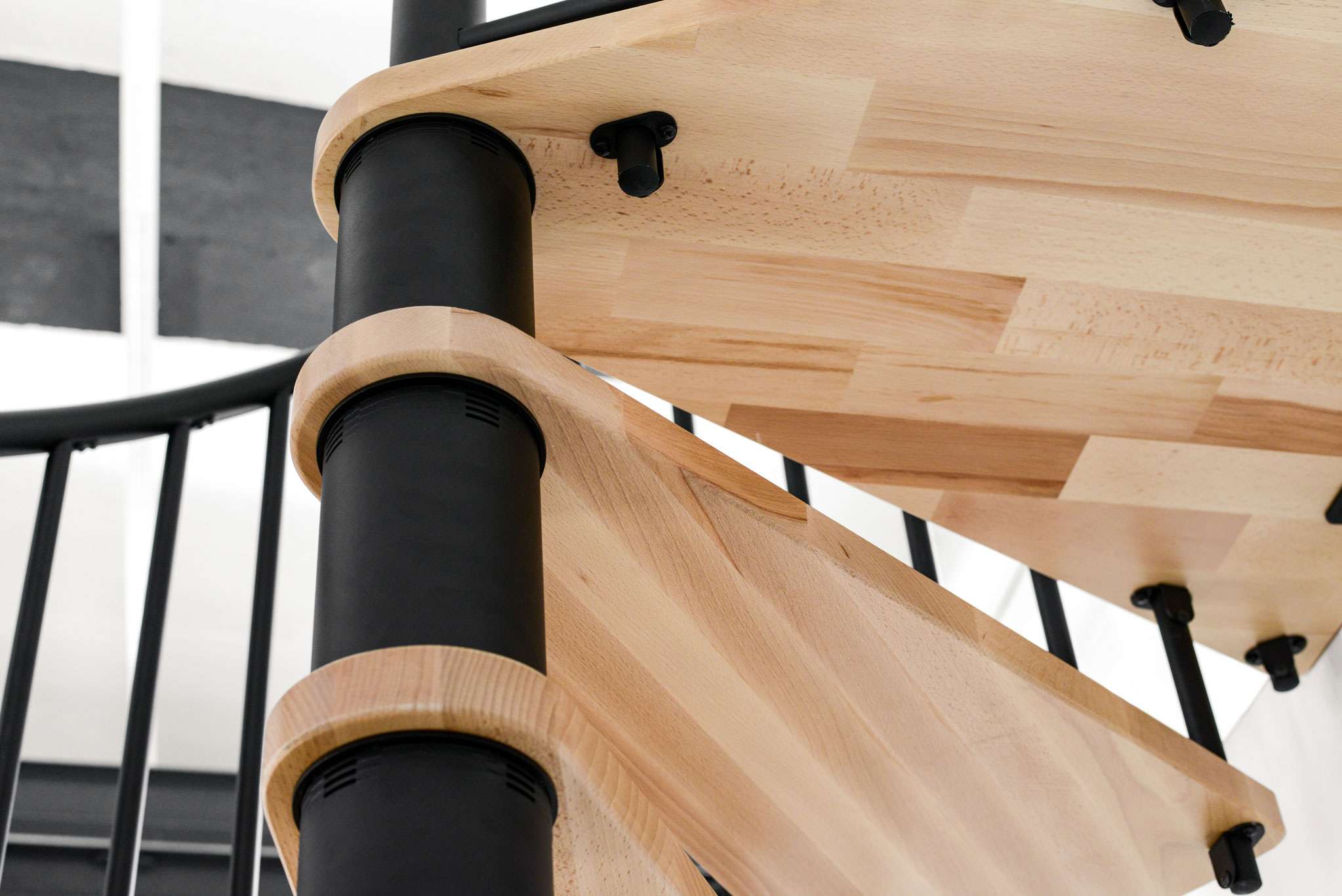 Das Holz für die Stufen aller Minka Treppen stammt aus europäischen Wäldern und wird gemeinsam mit den restlichen Teilen in Österreich verpackt. Die Metallelemente sind mit einer hochwertigen Minka Pulverbeschichtung oberflächenveredelt und damit äußerst resistent gegen Kratzer und sonstige Abnutzungen. Sie können sich also sicher sein, dass Sie mit Ihrer Spiral Smart Spindeltreppe lange Freude haben werden.