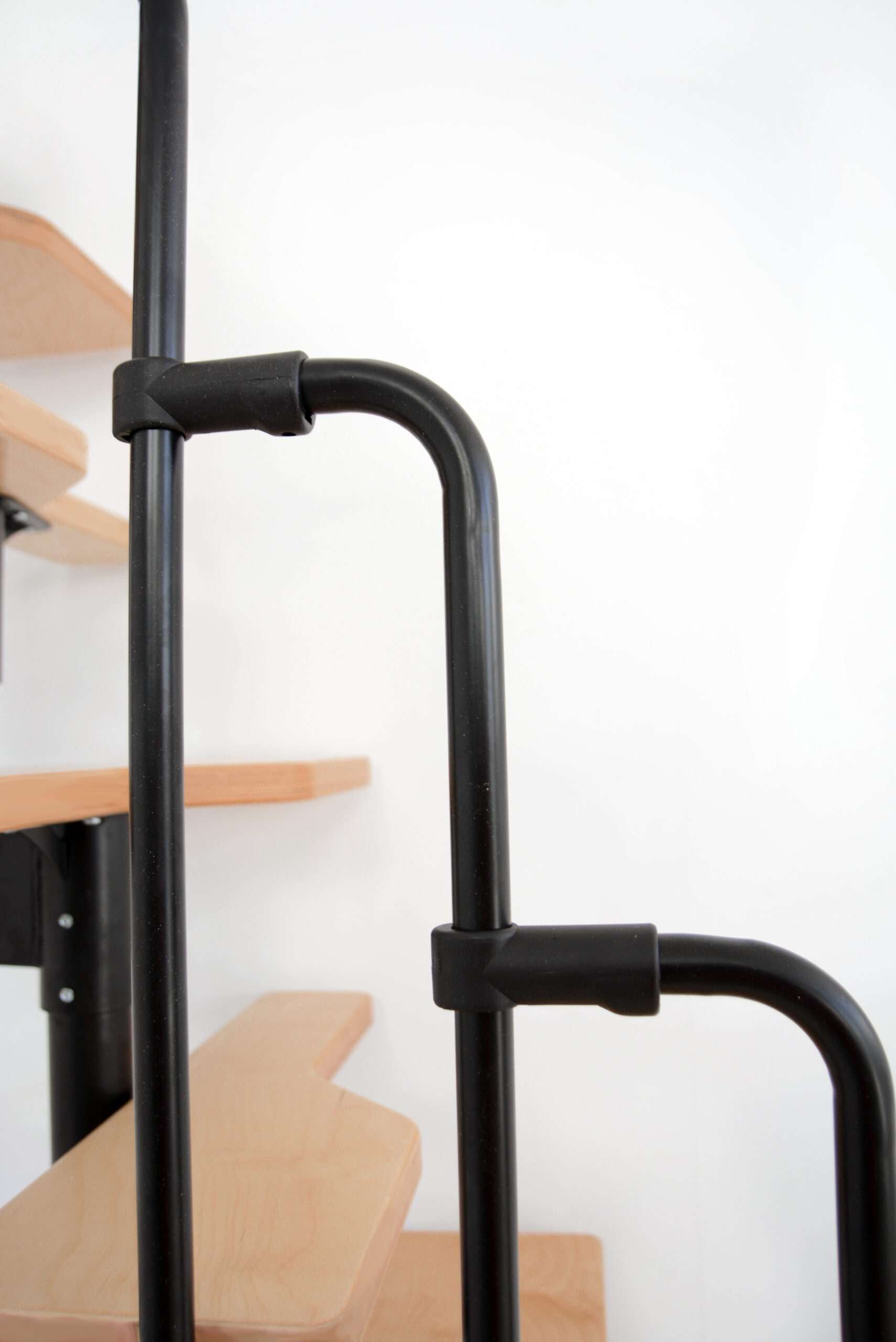 Die Mittelholmtreppe lässt sich je nach Wunsch gerade oder leicht nach links oder rechts gedreht aufbauen. Die Metallteile des Grundgerüstes und des Geländers sind mit einer Pulverbeschichtung oberflächenveredelt. Dabei haben Sie die Auswahl zwischen den Farben Schwarz, Grau und Weiß. Die markanten Stufen der Twister bestehen aus einem massiven Buchenholz, das durch die Lackierung leicht schimmert.