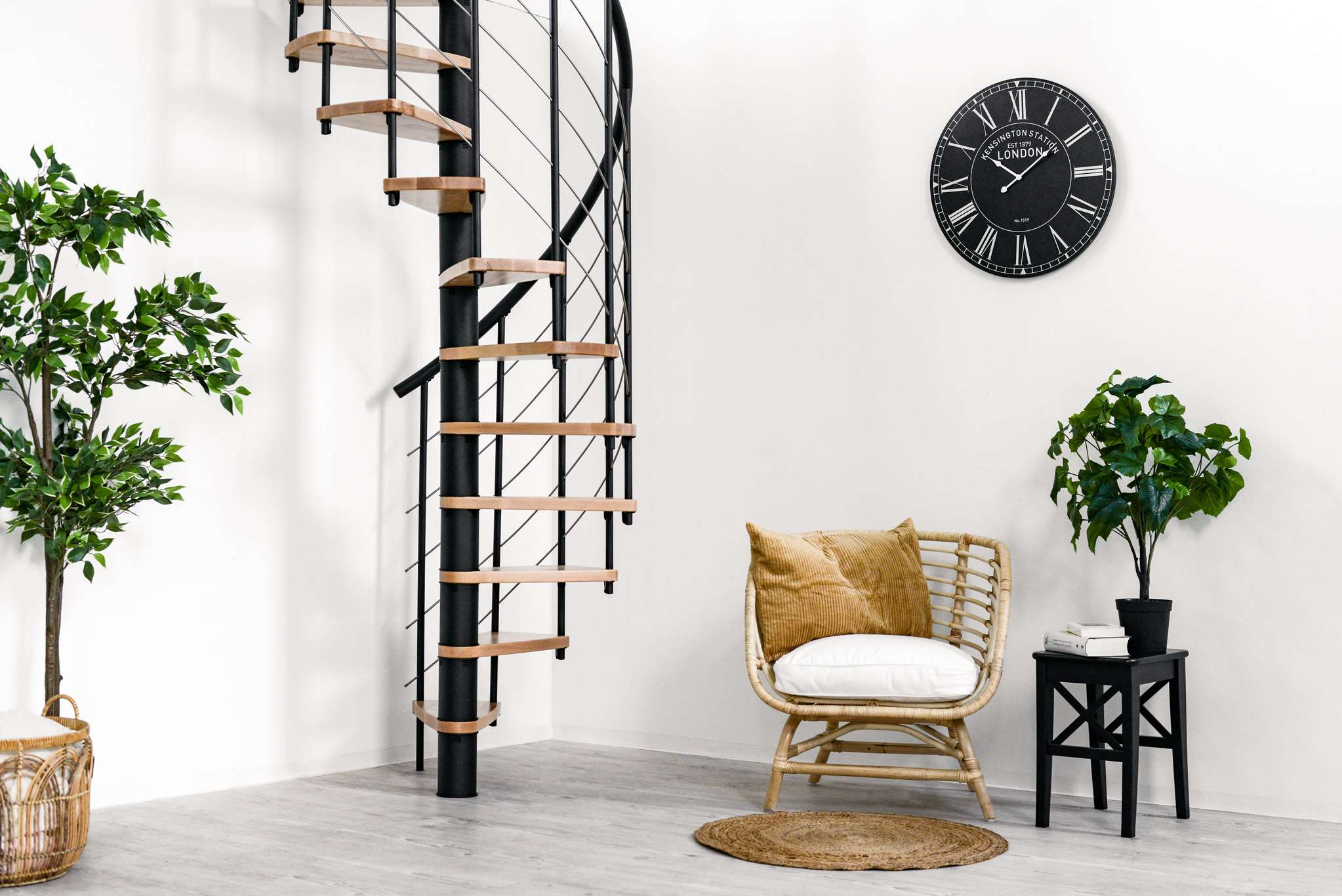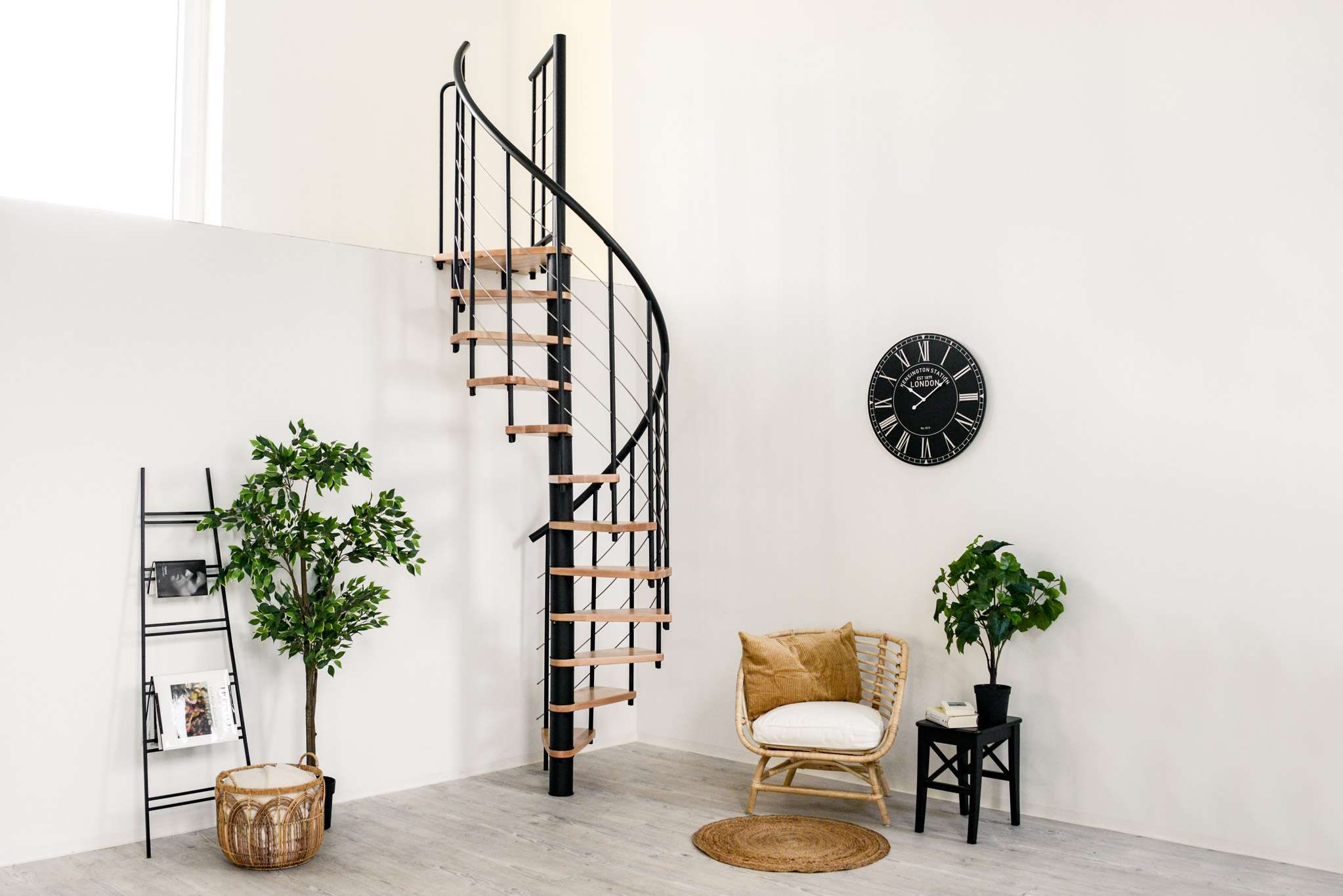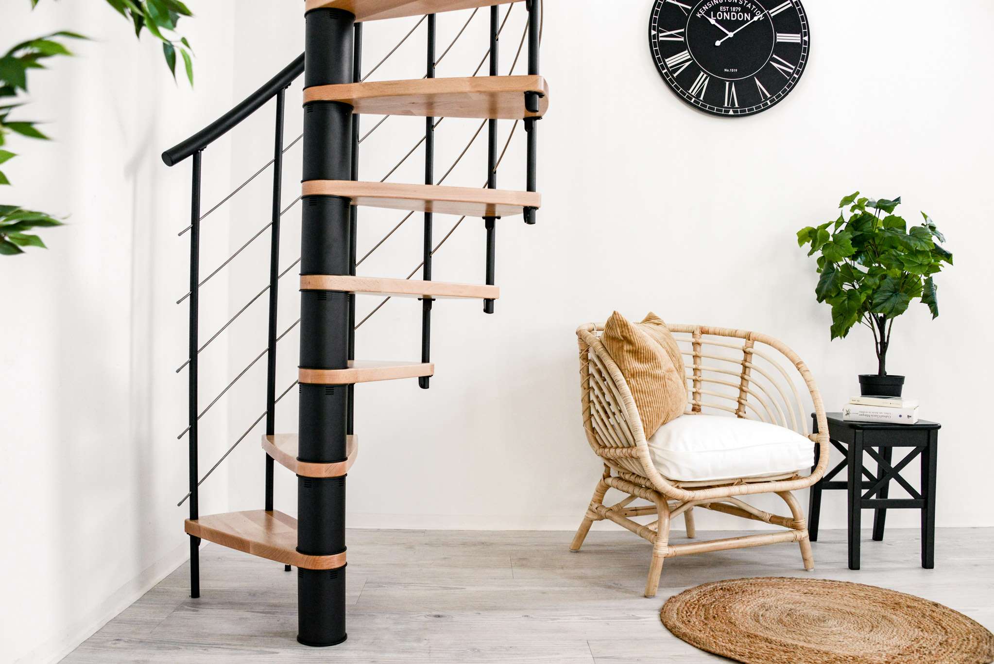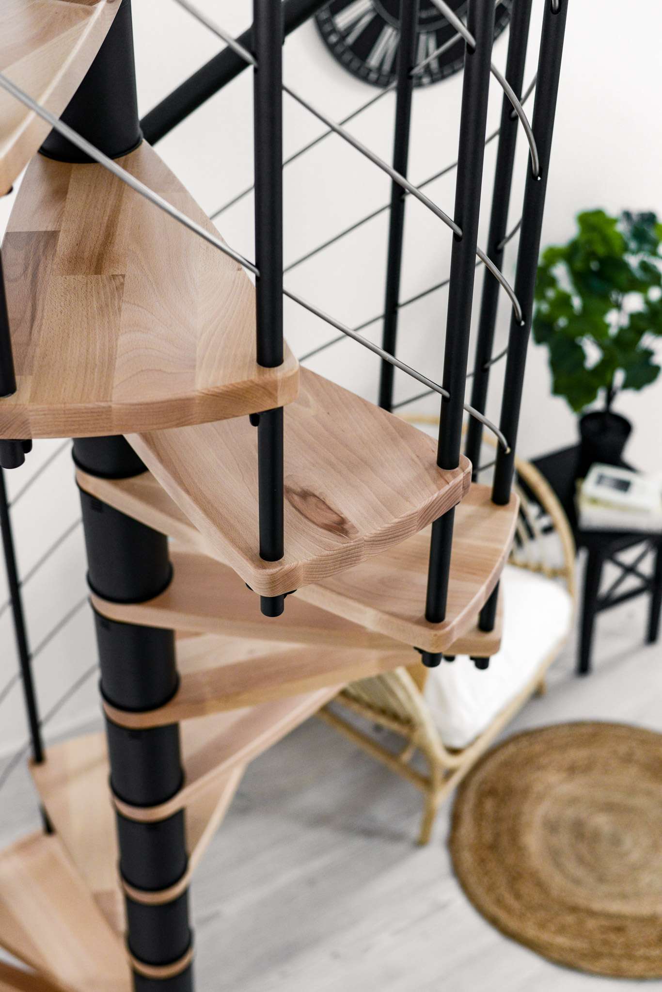 Die Venezia Smart zeichnet sich durch eine große Vielfalt an Varianten aus. Sowohl die Stufen als auch die Metallteile können farblich angepasst werden. Zur Auswahl stehen Buche, Walnuss, Eiche und Weiß für das Holz sowie Schwarz, Grau und Weiß für die Metallteile und den Handlauf. Der Handlauf der Venezia Smart besteht aus hochwertigem PVC, welcher sich angenehm in die Hand schmiegt. Diese Spindeltreppe gibt es in einem Durchmesser von 100, 120, 140 oder 160 cm.